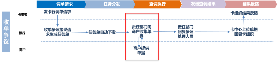 “调单”是银行的一项重要服务,其常规流程为外卡组织(发卡行)向收单行发送调单请求,收单行需要下发调取交易凭证请求到分行处理,分行接到请求再联系商户调取交易凭证。但如果分行或商户延误处理,则影响收单行反馈外卡组织(发卡行)的调单请求,对业务造成不良影响。